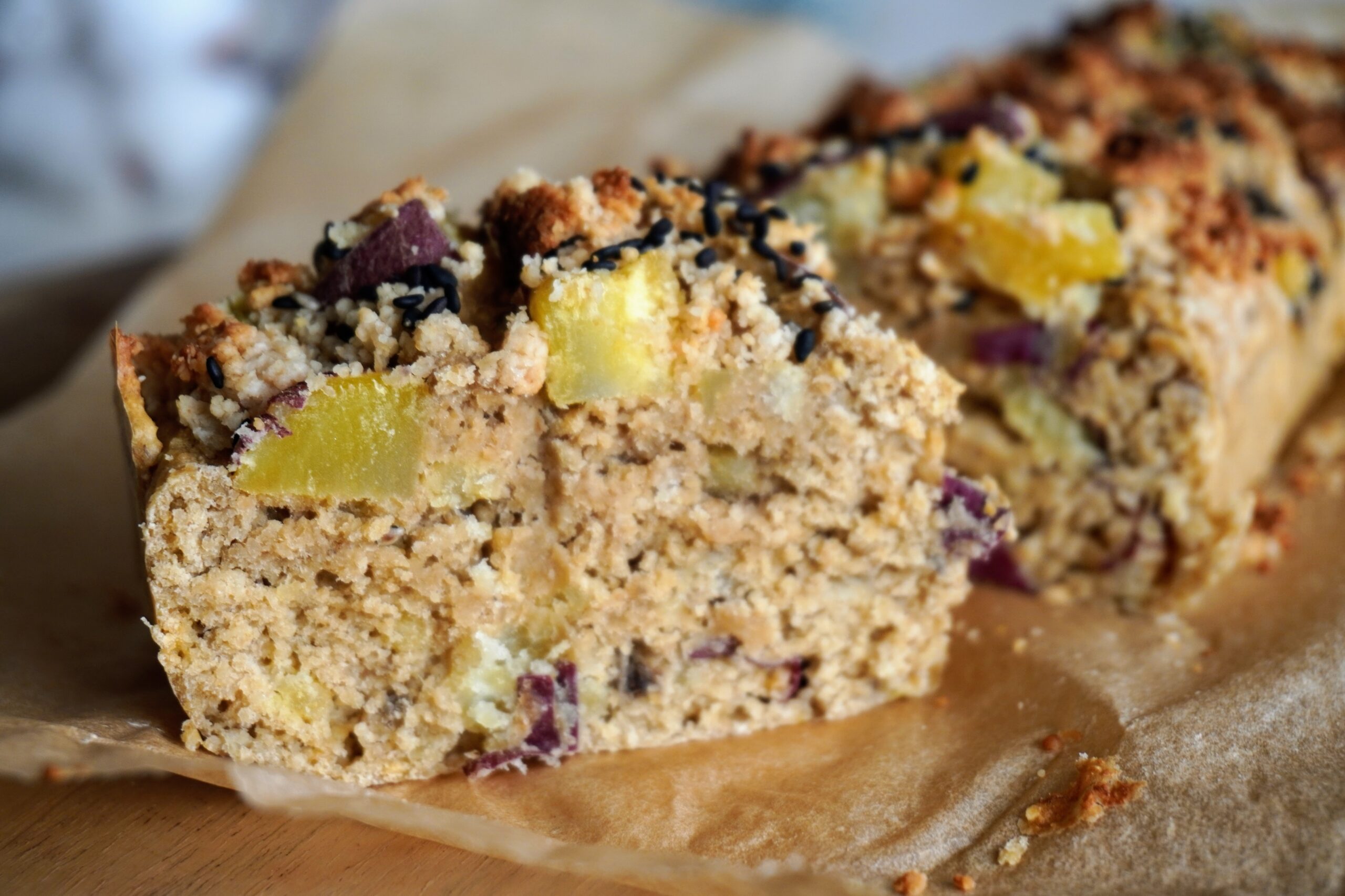 4. Pour the batter into the baking tin. Top with the remaining sweet potato pieces, sesame seeds, and finally the crumble.