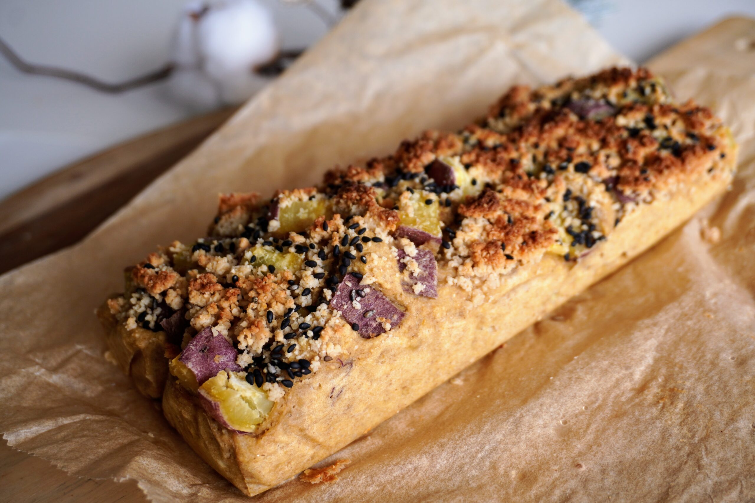 4. Pour the batter into the baking tin. Top with the remaining sweet potato pieces, sesame seeds, and finally the crumble.